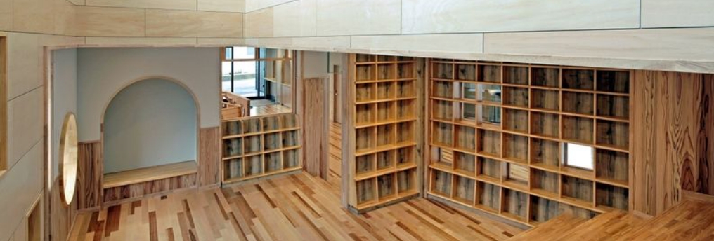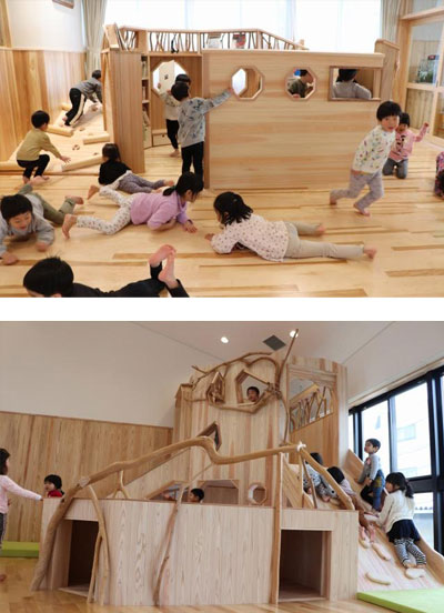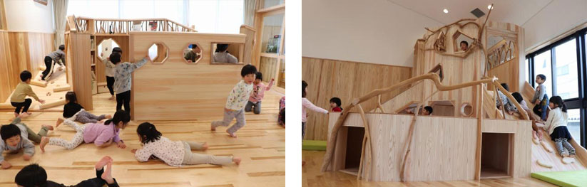 木工製作作家の【やまのおうち】とコラボレーションした舟の形をモチーフとした「ノアの箱舟」、2階には、ボルダリング、すべり台、トンネルを組み合わせ、小さな舞台と衣装部屋のある「劇ごっこ遊び」など子供たちが走る、転がる、登る、すべるなど木に触れ、ぬくもりを感じる空間で心身ともに健やかに育つ環境を作り出しています。