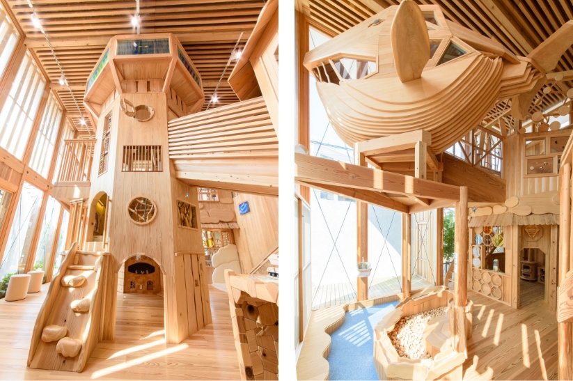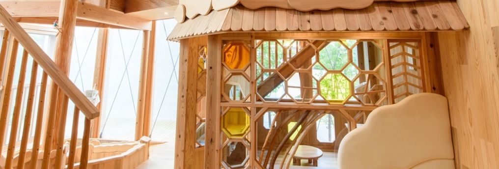 入った瞬間、木の香りに包まれるこだわりの遊具、手作りのおもちゃに絵本など、ドキドキワクワクがいっぱいの遊び場です。こだわりが詰まったテーマごとの8つのエリアで木の香りや手触り、色を五感で感じて、子どもも大人も 一粒の雫になって、一緒に空想のソラへ。さあ冒険のはじまりです。思う存分遊んでください。