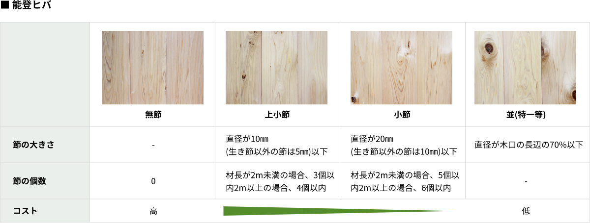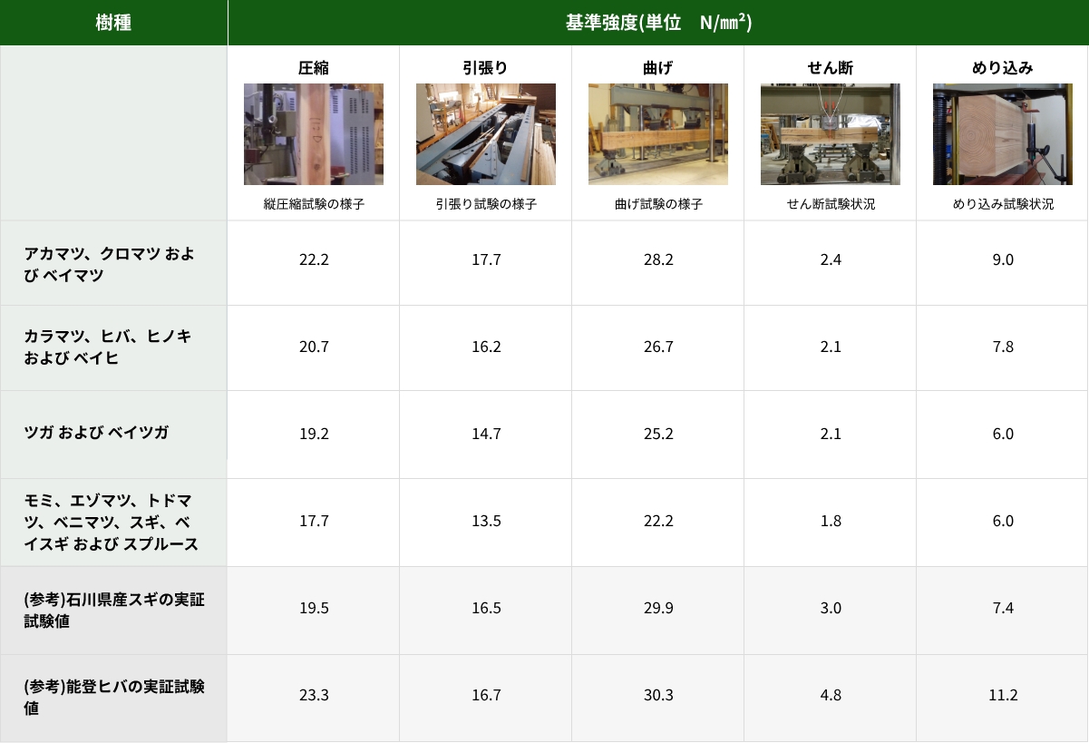 もちろん県産スギ、能登ヒバも、ともに国土交通省が定める製材の基準強度(無等級材)を上回っており、建築用部材として問題なく使用できます。