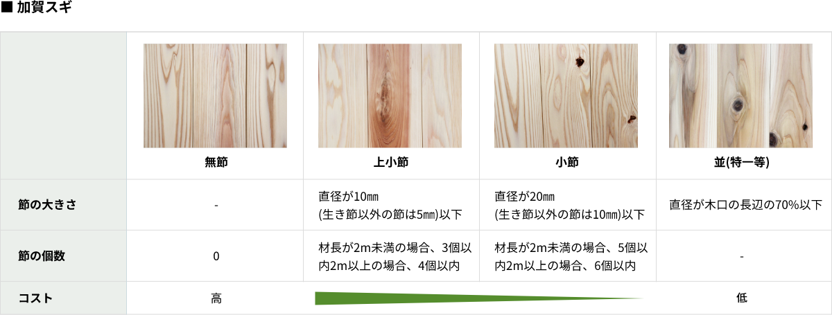 木材の等級は、無節、上小節、小節、並(特一等)と、見た目の良し悪しで分けられます。並は、等級としては最も低いものですが、目に見えない場所に使う構造材や下地材に使用されます。節を活かしたデザインなど、活用方法は様々に広がっています。
