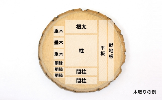 原木や大型の木材から、必要な寸法・品質の木材を製材することを「木取り」と言います。曲がり、断面形状、節、割れなど、丸太の形状や欠点を考慮して、いかに歩留まりをよくするかを考えながら必要な寸法や品質の木材を取り出していきます。