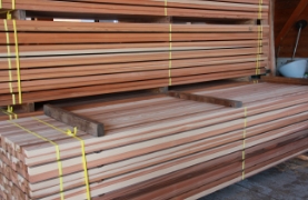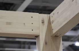 ラミナと呼ばれる断面寸法の小さい板材を繊維方向に揃えて、厚さ・幅及び長さ方向に接着剤で貼り合わせた木材です。