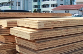 板状に製材・乾燥した板(ひき板)を繊維方向が直交するように重ねて接着した、板状の材料です。厚みのある大きな板であり、建築の構造材の他、造作材、家具などにも使用されています。